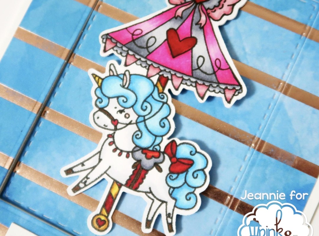 I set out to create a really simple version since these images were pretty large so I only needed one. I basically grabbed a piece of acetate to help me create a mirror image of the stamp. I stamped it one on cardstock and then stamped the same image on a piece of acetate. I used the image on acetate and pressed it against the cardstock, transferring the image. It wasn’t perfect but I ended up outlining the image again to darken the lines. Once I finished coloring them, I die cut the images using the coordinating Sweet Carousel dies. For the mirror image, I had to die cut on the backside of the image.