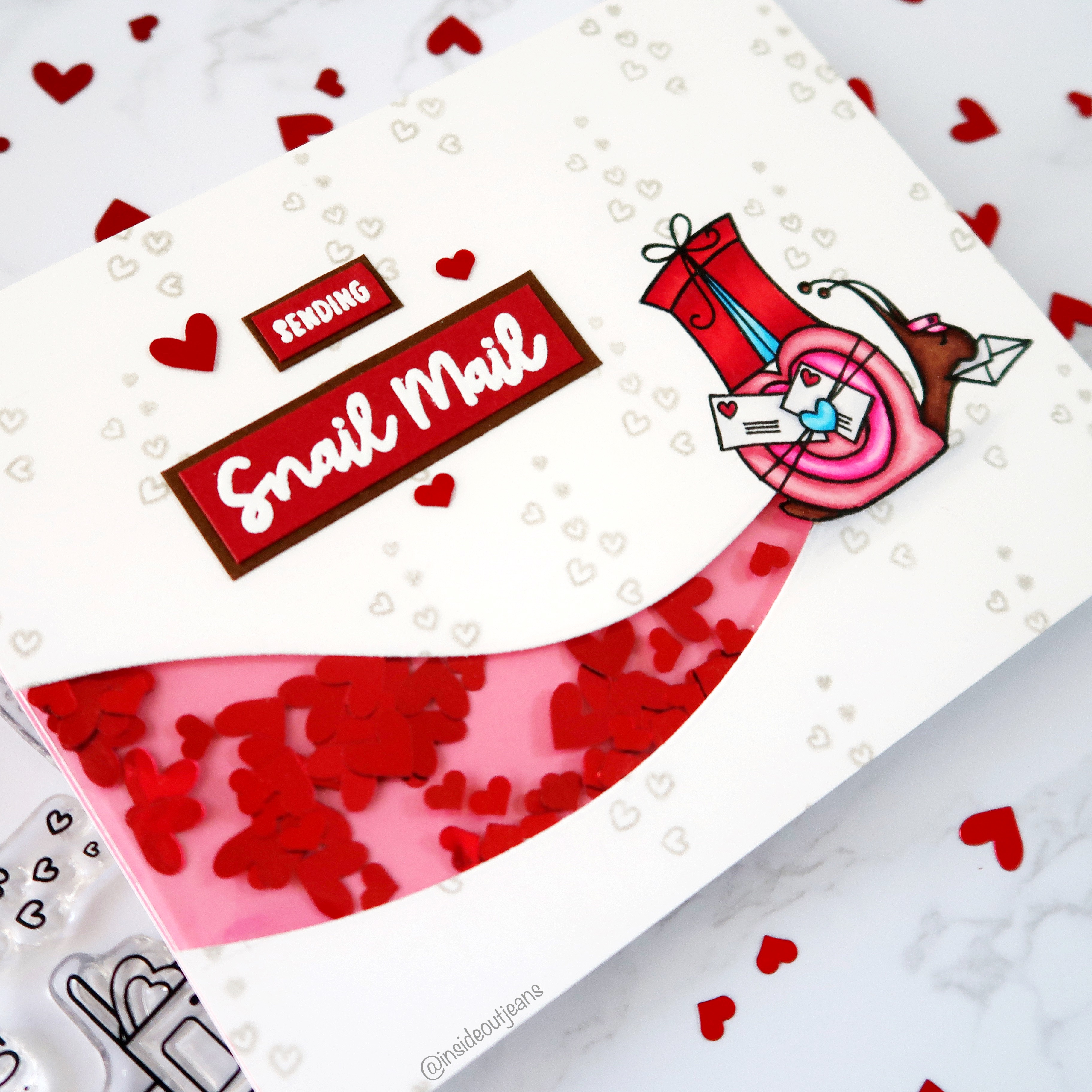 My second card also contains an interactive element, a shaker, but I kept most of it pretty simple. I stamped Mr. Snailman on the right side of the card. I created a mask for him and stamped out the bundle of hearts all over a piece of A2 cardstock in a light grey creating the look of patterned paper.