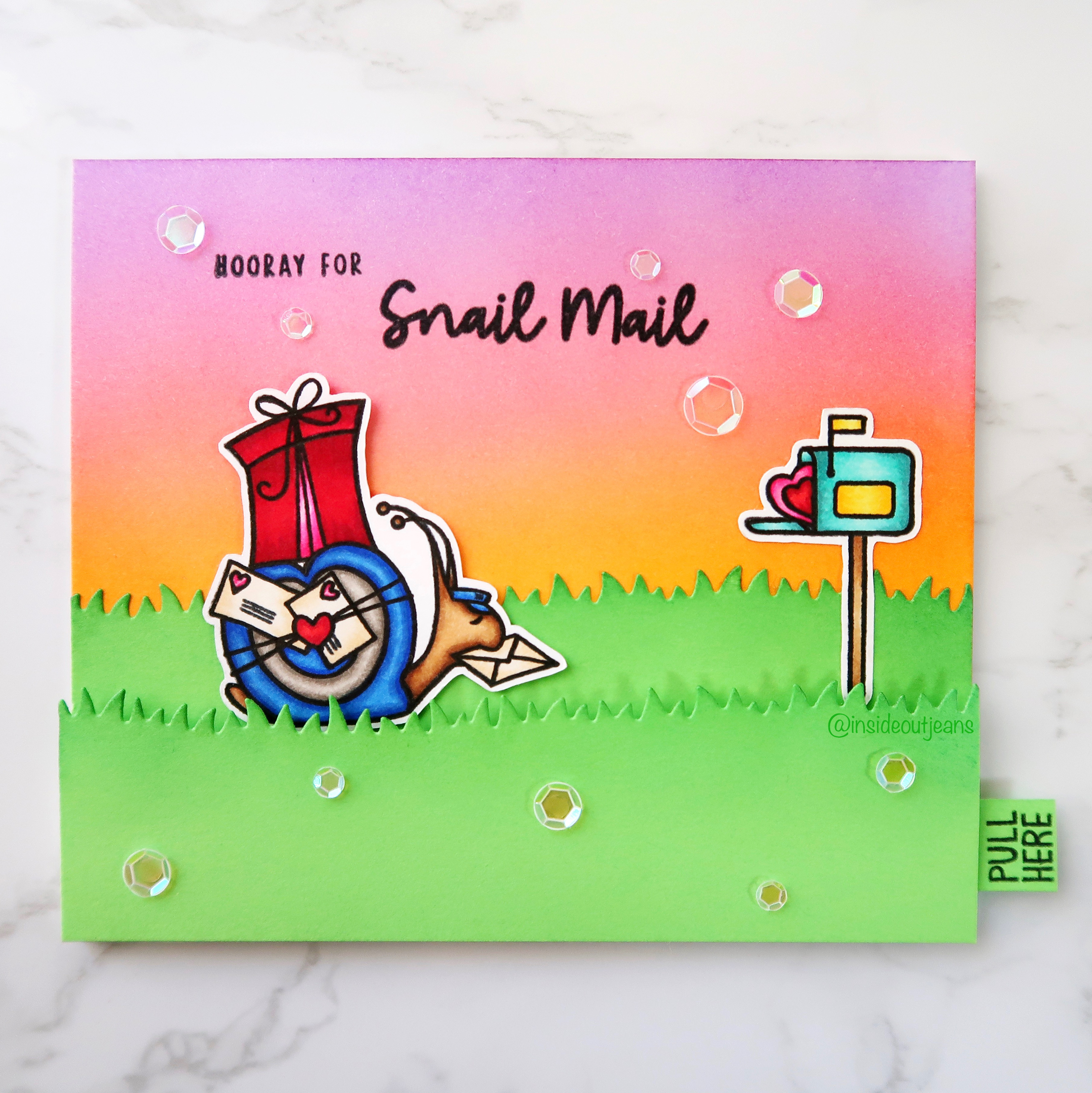 Since this is a smaller stamp set with two main images, created a distress ink background for a sunset sky to fill out a scene behind the images. I added some grass die cuts to the bottom of the card and hid my slider. To finish off this card, I stamped a sentiment “Hooray for Snail Mail” on the top of the card and added Soapy Bubble confetti to embellish the card.
