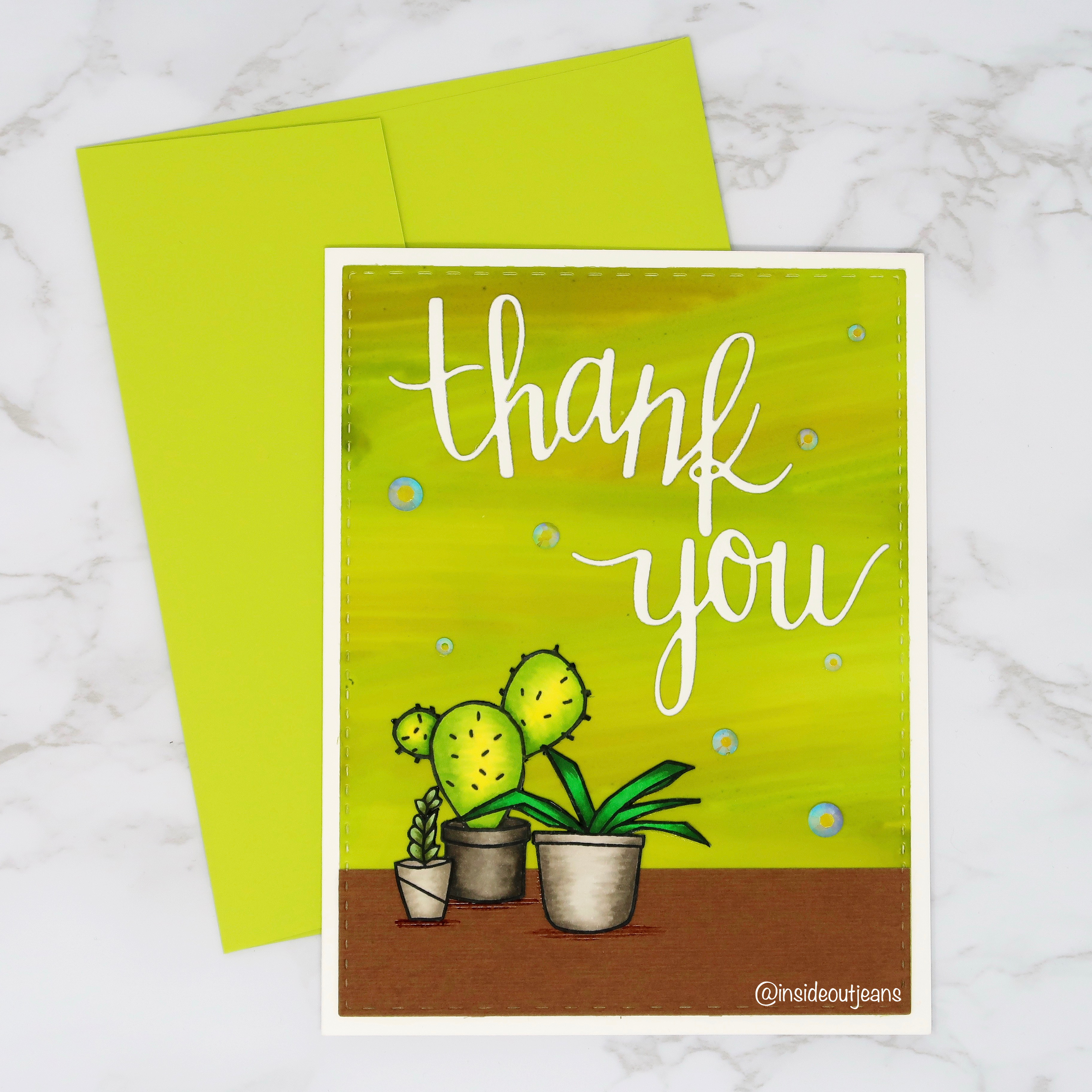 For the card portion, I found a background I created awhile back while playing with alcohol inks and it was just perfect to go along with the Plants. I colored everything the same way. I used Pink & Main Stitched Rectangles 2 for the yupo background so it can be matted on a white card base. I used the Thank You die from a pretty old Hero Arts My Monthly Hero set. I added brown cardstock to the bottom of the card, making it look like a table for the plants to sit on. To finish off the card, I added some Studio Katia Iridescent Crystals.