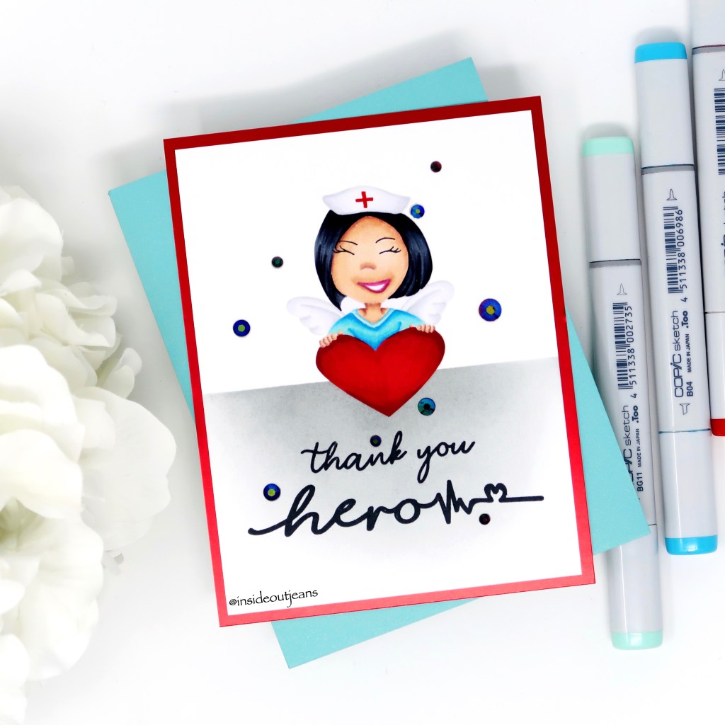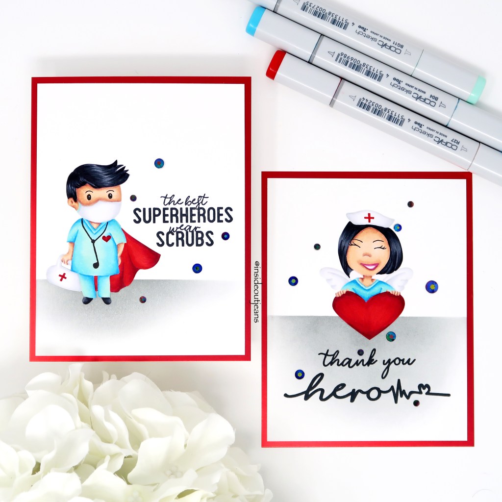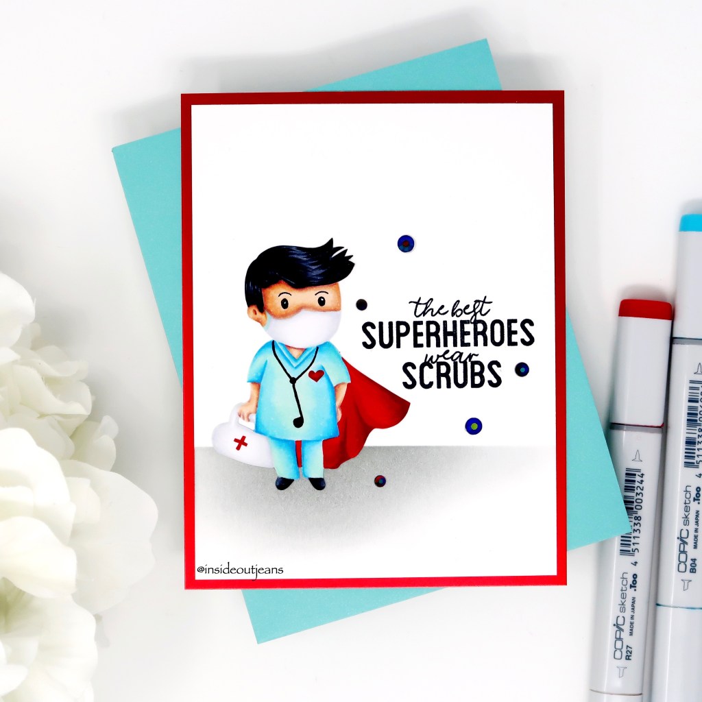 The Superhero Scrubs includes so many fun sentiments that are perfect for creating a card that all you need is the image paired with one of them and that’s what I did here. For the male nurse, I placed him next to the “The Best Superheros Wear Scrubs”. For the female nurse, I used two sentiments: “Hero” and “Thank You”.