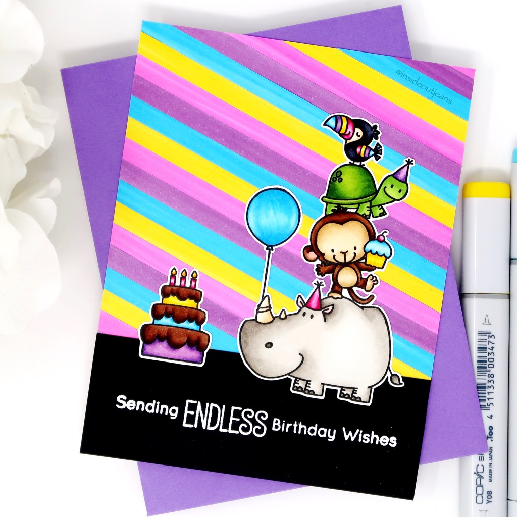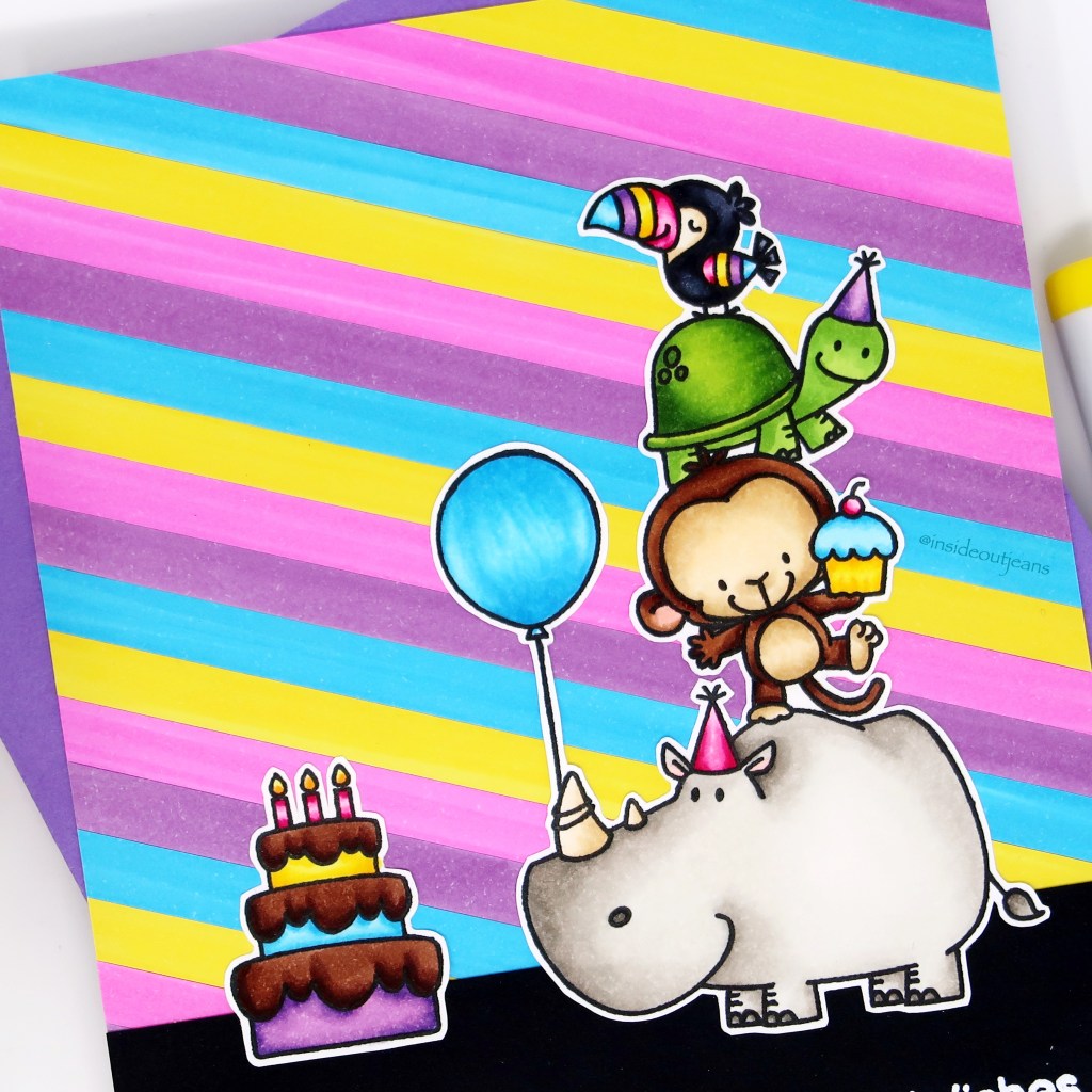 I stamped out the images using Ink on 3’s Blackout Ink and colored them up using copic markers. I used a variety of blue, pink, purple, and yellow throughout the entire card so it would be cohesive.