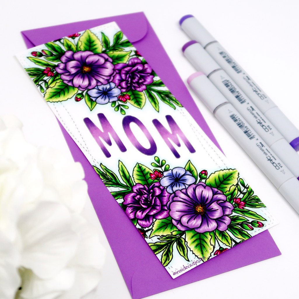 Afterwards, I decided to use the Marshmallow Alphabet to cut out the letters to spell MOM and colored them using the same purples I used for the florals. Once those were colored in, I added them to the card and thought this was so pretty for my mom. Plus she loves purple!