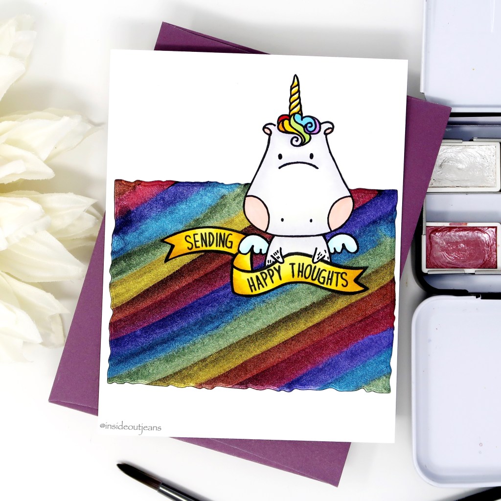 Using the Altenew’s Metallic Watercolors on Stathmore Black Mixed Media, I simply used a dense brush and created lines in rainbow order. Using Honey Bee’s Deckle Rectangles, I cut out two different sized rectangles. I used them in two different directions adding the Unicorn from Be Her and the Bunny from Be Him.