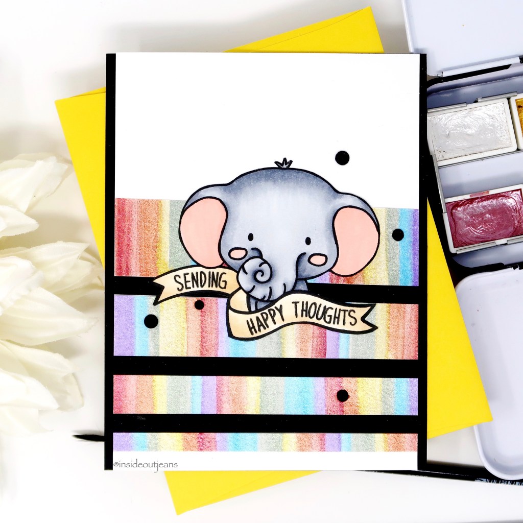 For my last card, I colored a piece of Canson XL watercolor paper with different sized stripes in rainbow order. I trimmed down this piece in different sizes and arranged them on the card and alternated with strips of black cardstock.