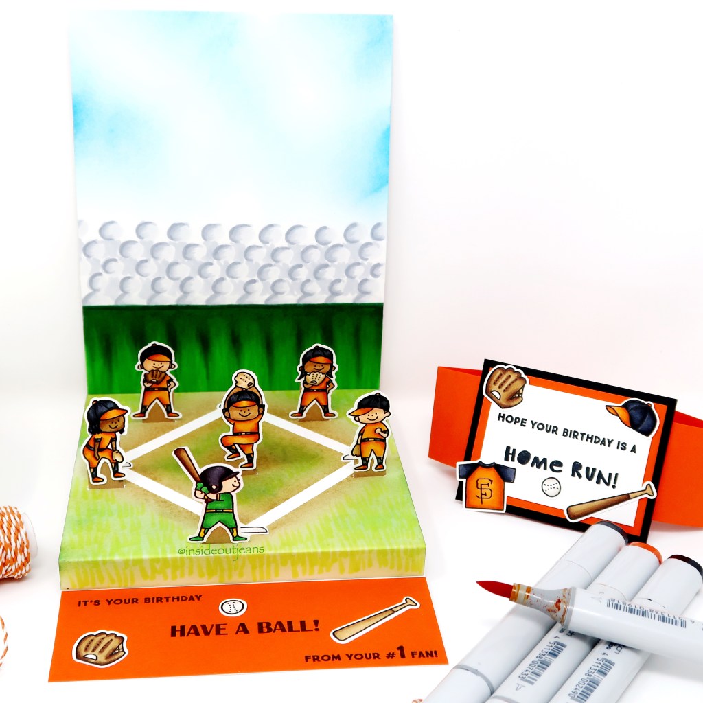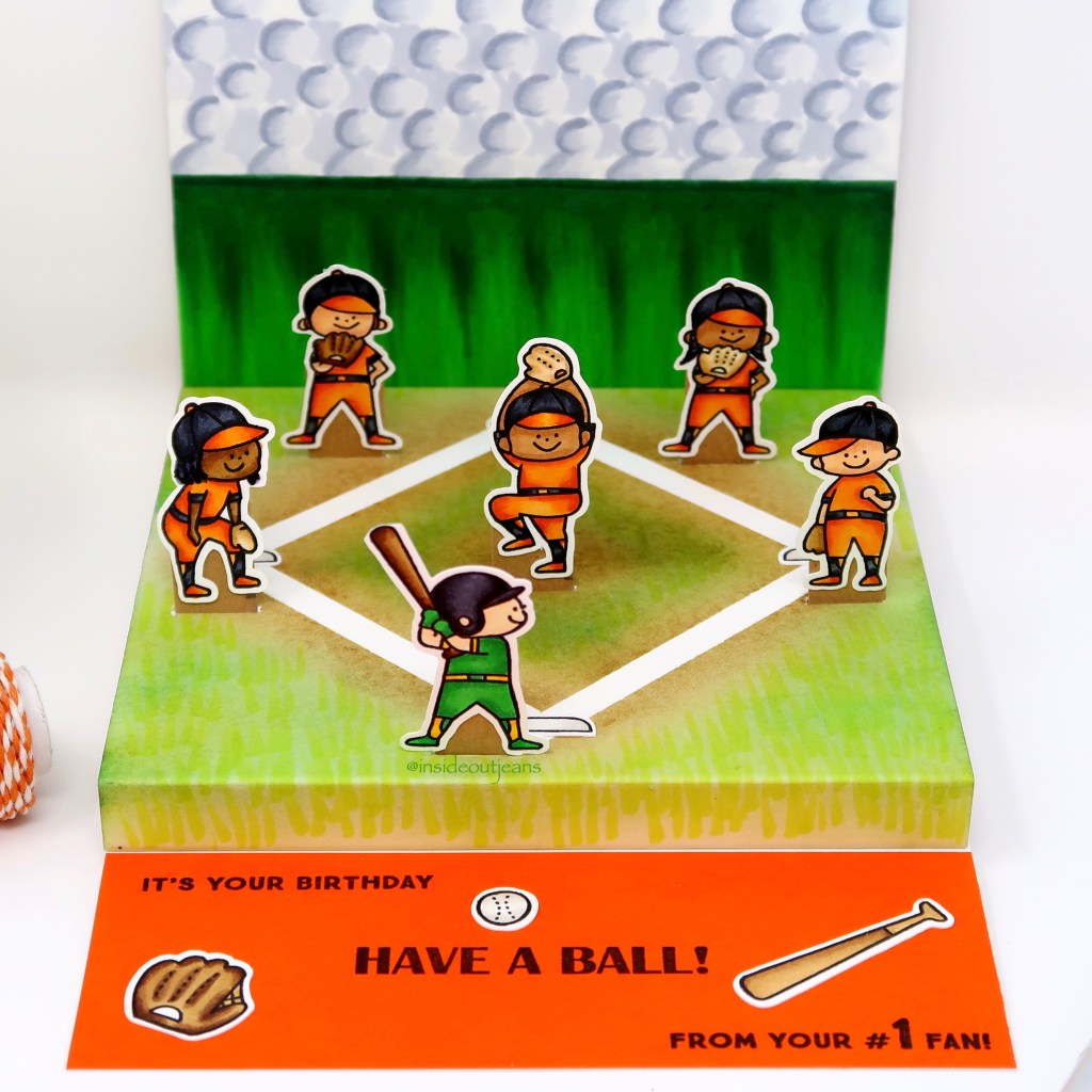 I stamped images from the Waffle Flower’s Batter up stamp set using Memento Tuxedo Black ink. I created a scene using distress inks to create a baseball field and colored in all the images using copic markers. I just had to create a little infield that fit into this 5×7 card within a floating floor pop up card. To finish this off, I used a ton of the sentiments in this set. Isn’t it so cute?