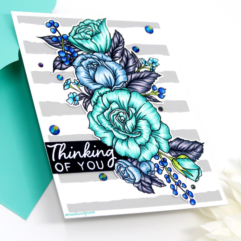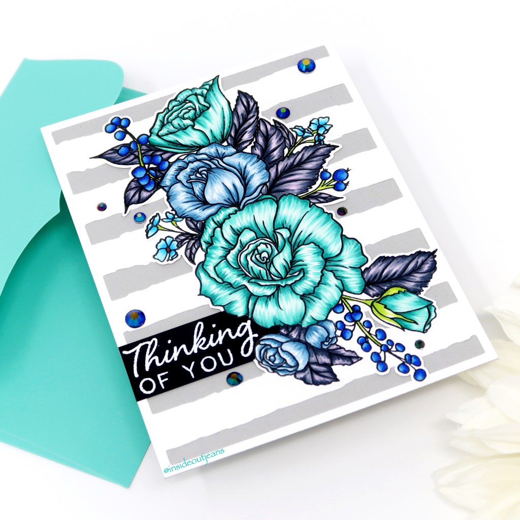I stamped images from Honey Bee Stamps Everything Wonderful stamp set using Ink on 3’s Blackout ink. Then I colored them up using copic markers (colors listed below). For the background, I used Honey Bee Stamps Watercolor Line Cover die and placed it on top of a piece of grey cardstock. I added the sentiment by stamping it with Juicy ink on top of black cardstock and used Artic White Embossing powder. To finish off the card, I sprinkled a bunch of black embellishments around the florals and sentiment.