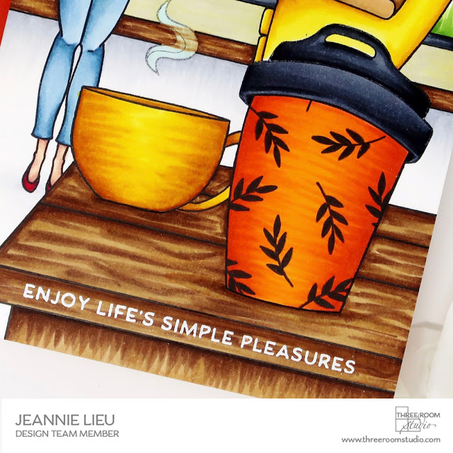 Hi everyone! It’s Jeannie (InsideoutJeans) on the blog today with Three Room Studio‘s stamp sets sharing a scene card to celebrate Fall. I pulled out a few stamp sets to put this card together. I envisioned how I felt when coffee shops started offering their seasonal drinks.
