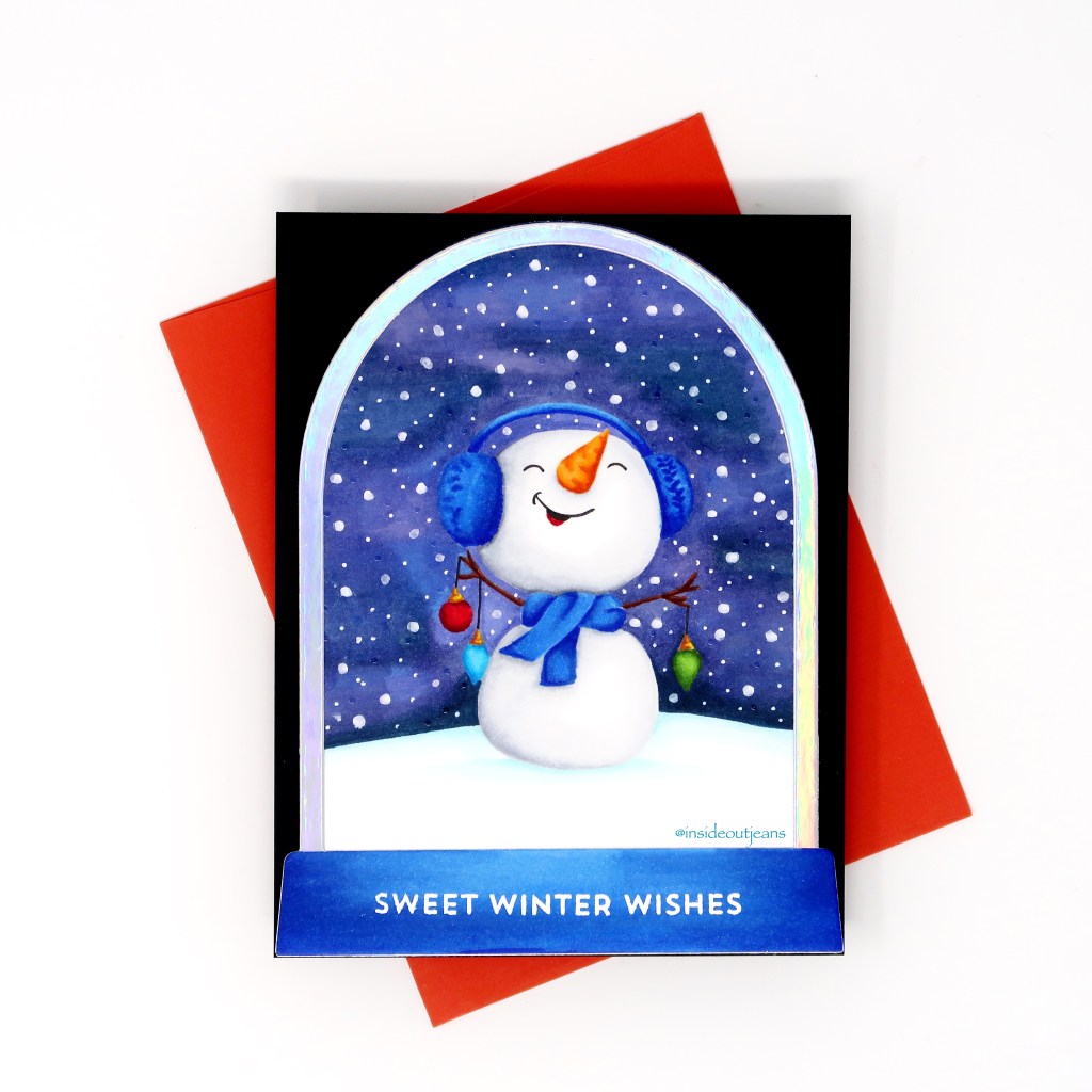 I stamped images from the Snow Buddies using Ink on 3’s Fadeout ink. Using copic markers, I colored up the snowman and background in a no-line coloring style. I cut out the main Snow Globe Shaker A2 using Holographic cardstock from Erin Lee Creative. It is SO pretty!