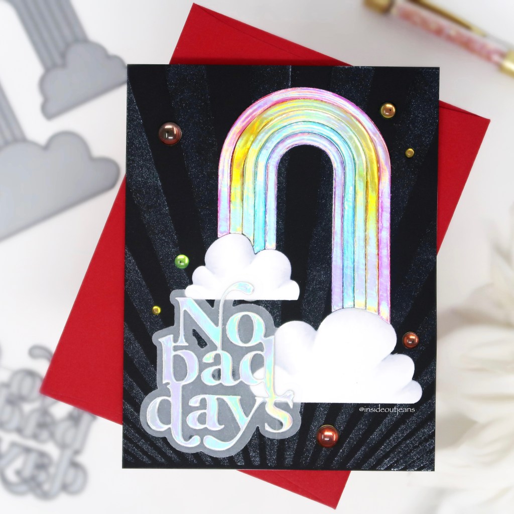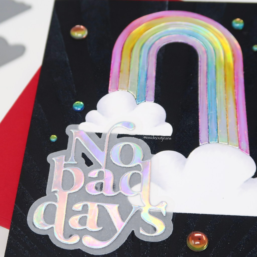 I went ahead and used that same Rainbow die to cut out the clouds out of white cardstock. I used some copic markers to add a bit of dimension to them.Also, in the kit, it has a standalone die and shadow for the No Bad Days sentiment. I cut out the words from holographic cardstock and the shadow from vellum.