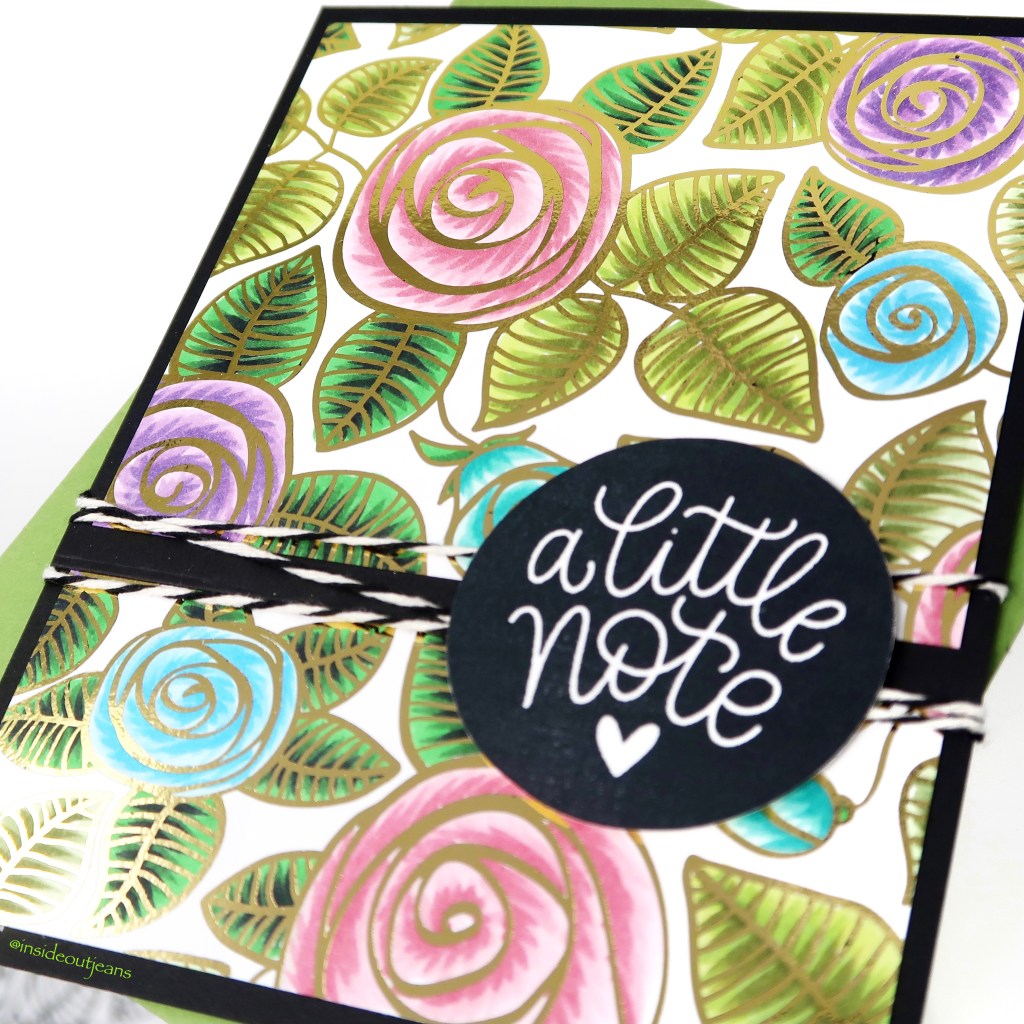 For the sentiment, I pulled out the Simon Says Stamp Just Because Word Mix 2, Lucky To Know You stamp set using Memento Tuxedo ink. Then I die cut them using the coordinating dies. I took a strip of black and added some twine to add to the sentiment, and added the “A Little Note” sentiment on top to finish it off.