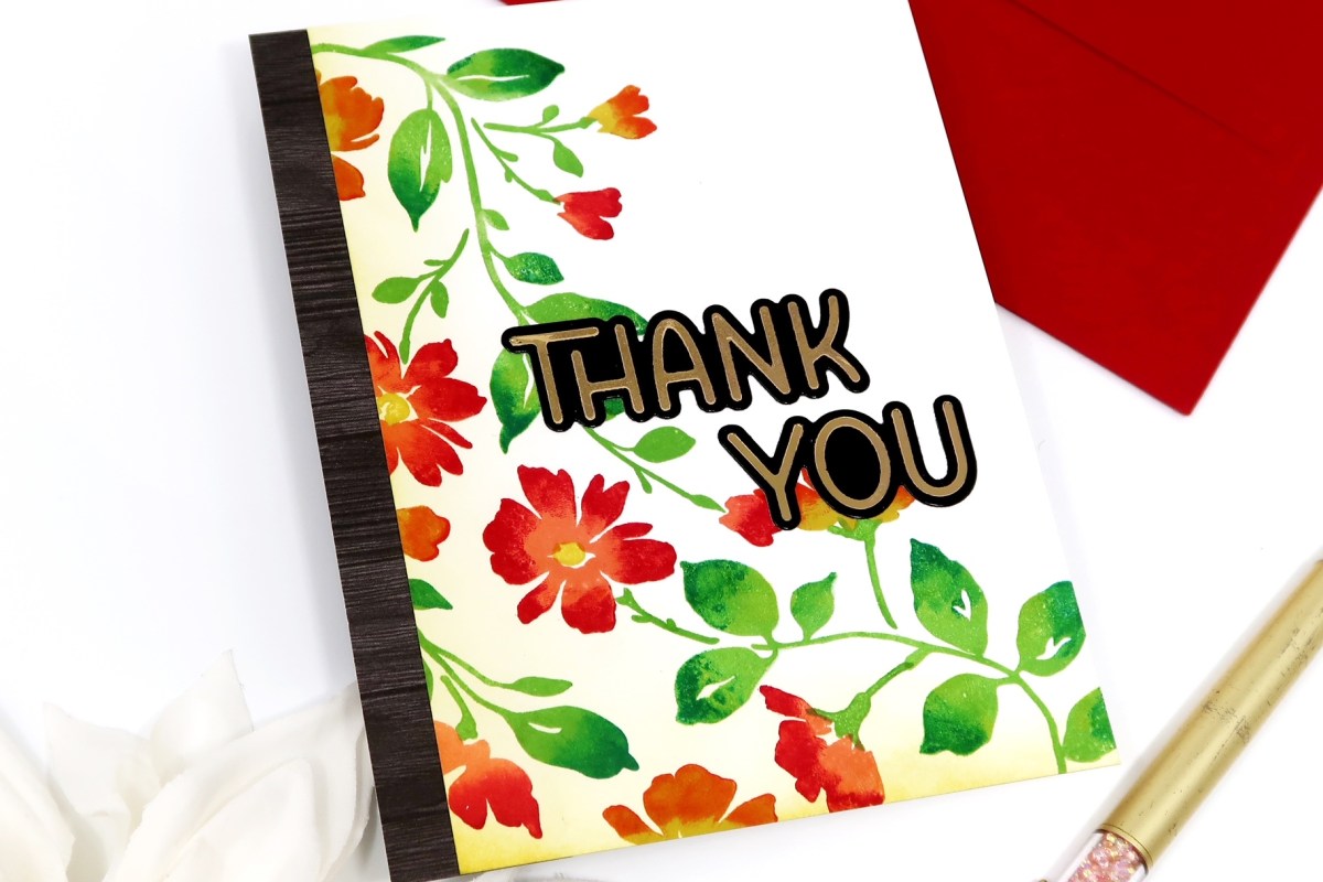 Make a card with me! I’m using this solid, floral stamp set to create a Thank You card. I aimed to go with fall colors… I’m not sure I achieved that but I really love how it came out. I also pulled out a piece of cardstock from a paper pad to anchor my card along with one of my already foiled sentiments to finish it off.