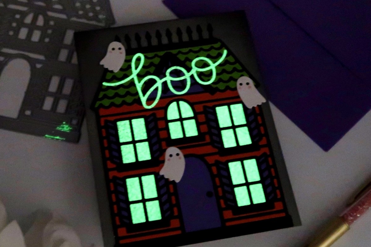 Halloween cards are those cards I rarely send out BUT they are the most fun cards to make. I look forward to them every year because it’s just fun! Added elements that you normally don’t put into you card just make sense with them — like glow in the dark. I loved using this Halloween House die as the focal point but when the lights turn off, the windows steal the show.