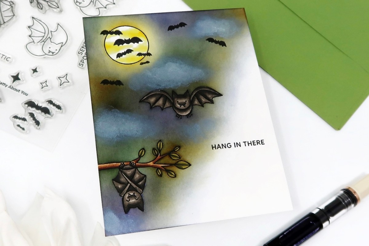Halloween scenes are fun and spooky but how about using a bit of white ink to add to your scene. For this card, I just used my fingers to create the clouds and it gives the card a mysterious air to it!