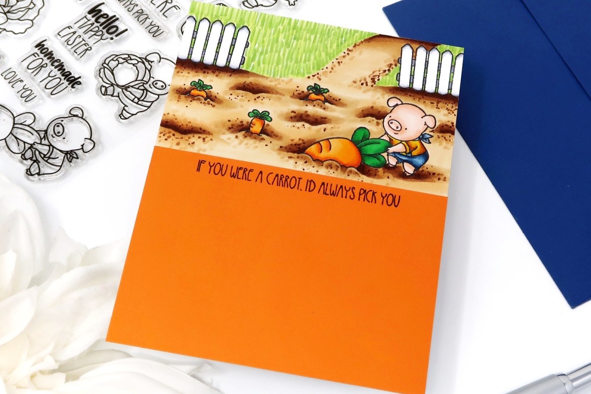 I rarely will make a card around a sentiment but when I saw this one, I had to! It made me chuckle because it reminded me of the booger one (If you were a booger, I’d pick you) and I just had to build the scene around the carrot images. I love how it turned out.