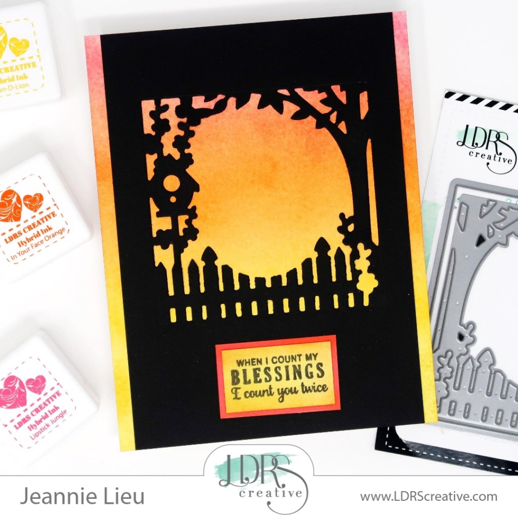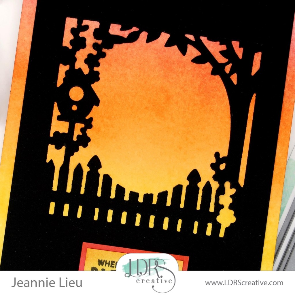For today’s card, I’m using LDRS Creative’s die set named, Garden Gateway die set. This is a simple die set but can be used in so many ways. It’s actually two pieces where you can use the die cut into a piece of paper (which is what I’m doing on black cardstock) or you can cut it along with it’s frame so it can be layered on top of another panel.