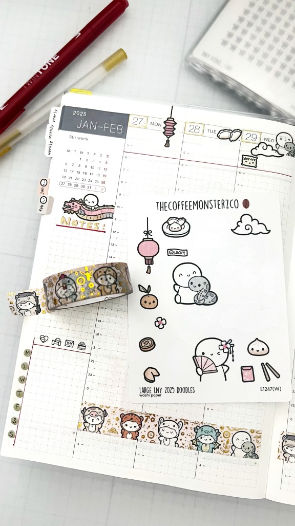 I had to pull out TheCoffeeMonsterZCo’s Large LNY 2025 Doodles to decorate my week for the Year of the Snake paired with the Chinese Zodiac Emotis washi tape. I also had to pull out my gold pen for some elements of gold and red throughout!