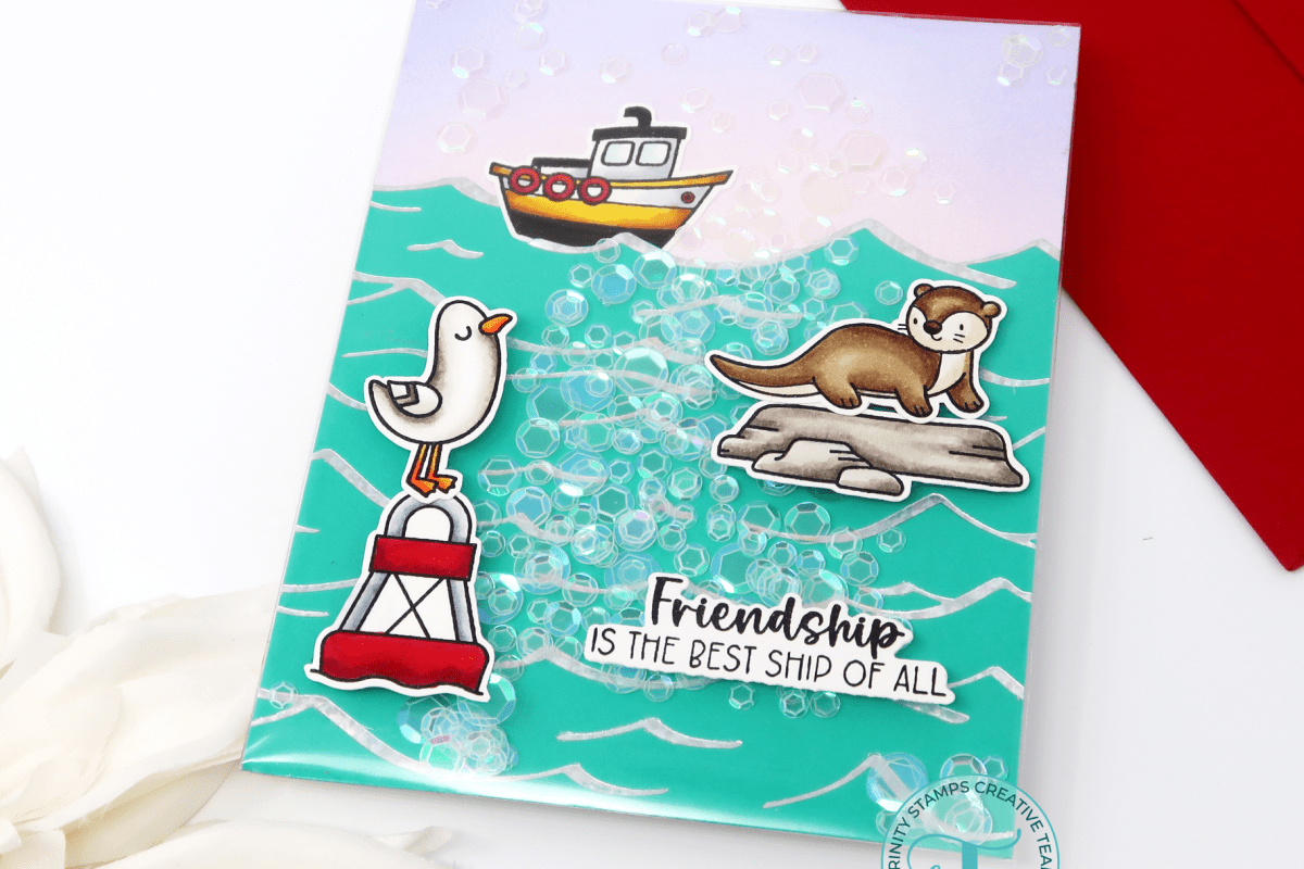 I stamped images from Friend Ship, You Go Gull, and Otter Side. They work perfectly together for my little water scene! I colored them up quickly using copic markers.
